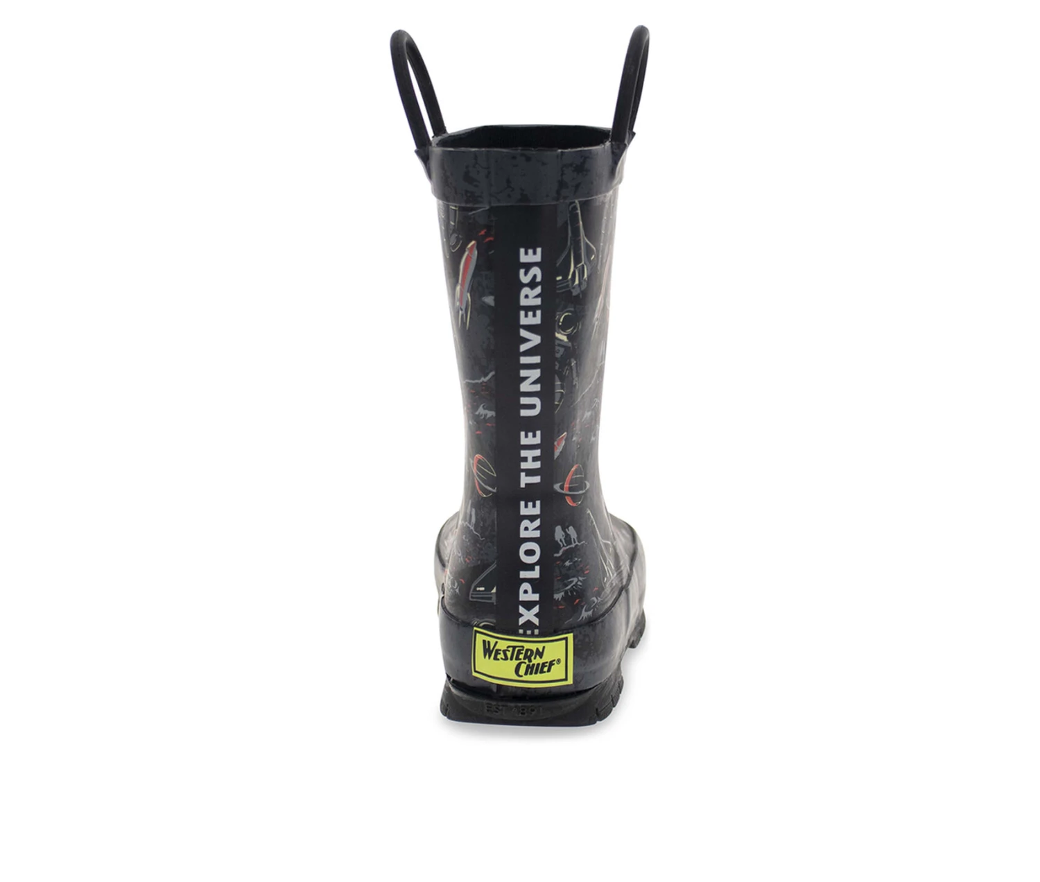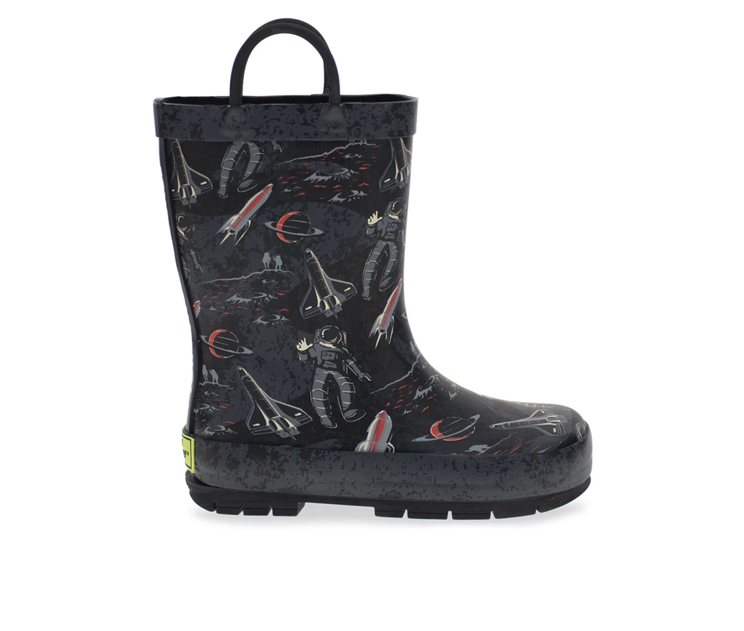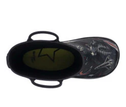 - Space monsters attack! Space fun ensues on tall kids waterproof rubber boots. Gripping no slip soles in fun dark shades with coordinated top outer sole detailing and double pull handle for easy on/off. Removable, easy to clean EVA insole for added comfort.