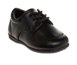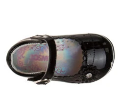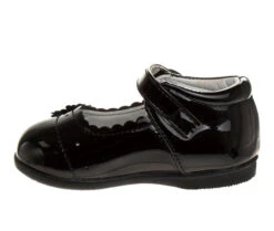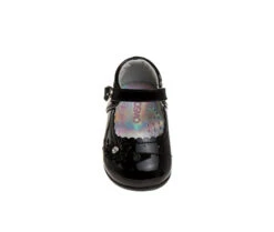 - A Girl Dressy Flat Patent Leather Shoe with Decorative Flower. The safe flat heel design is perfect for your little ones. Featuring a buckle closure for easy on and off. This shoe design is perfect for dressy or special occasions, great for going to weddings, church and other formal events. Fits perfectly with a great variety of outfits.