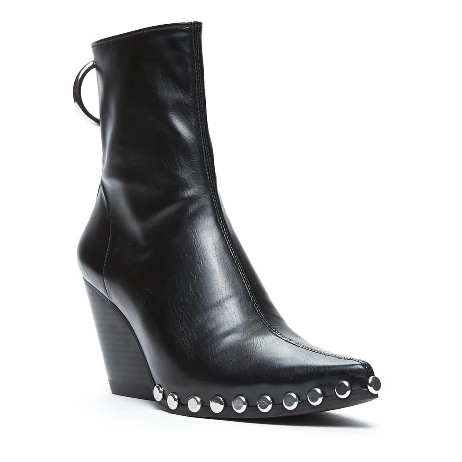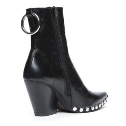 Western heeled boot with metal embellishment.