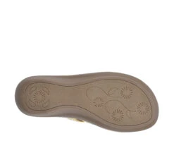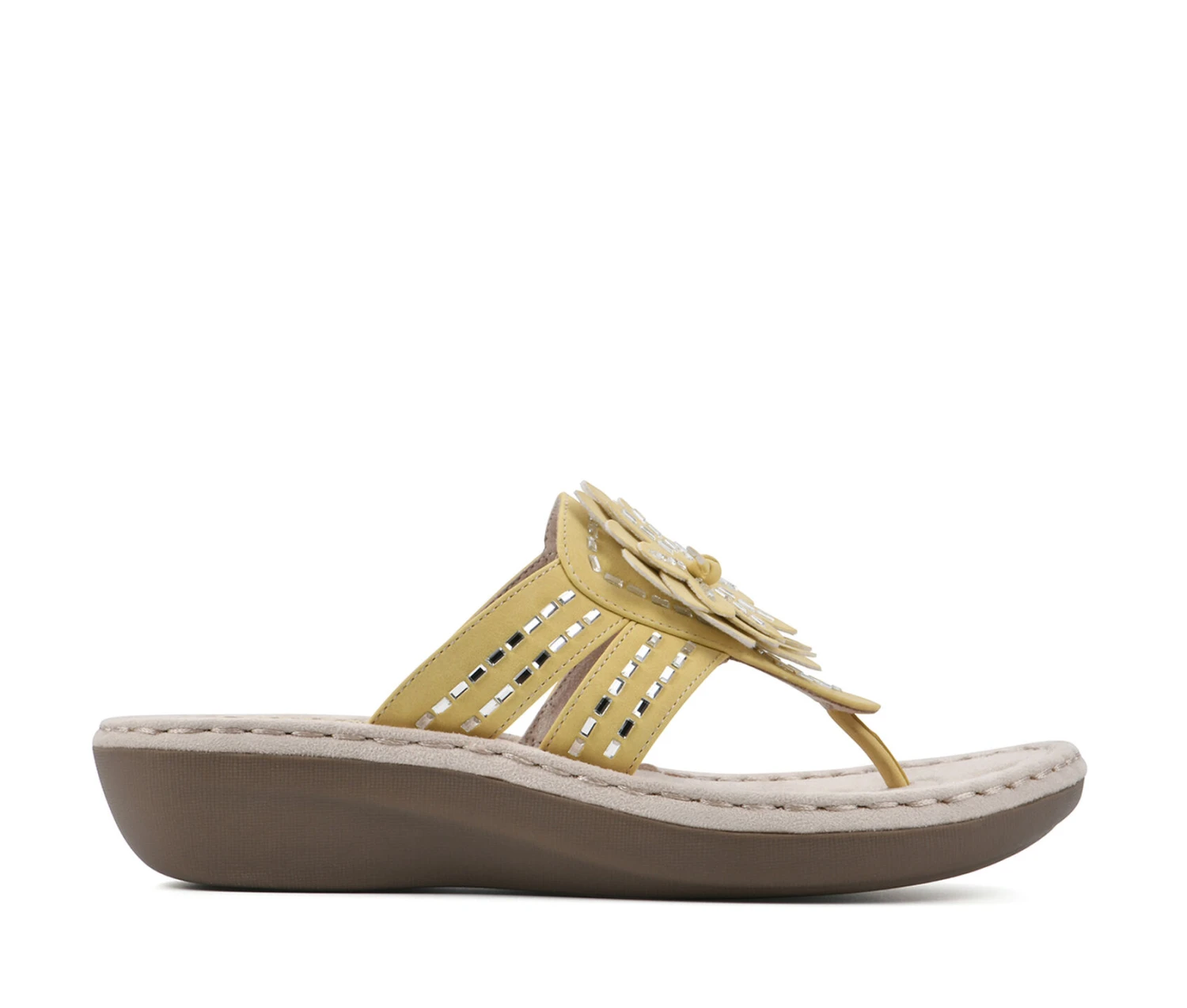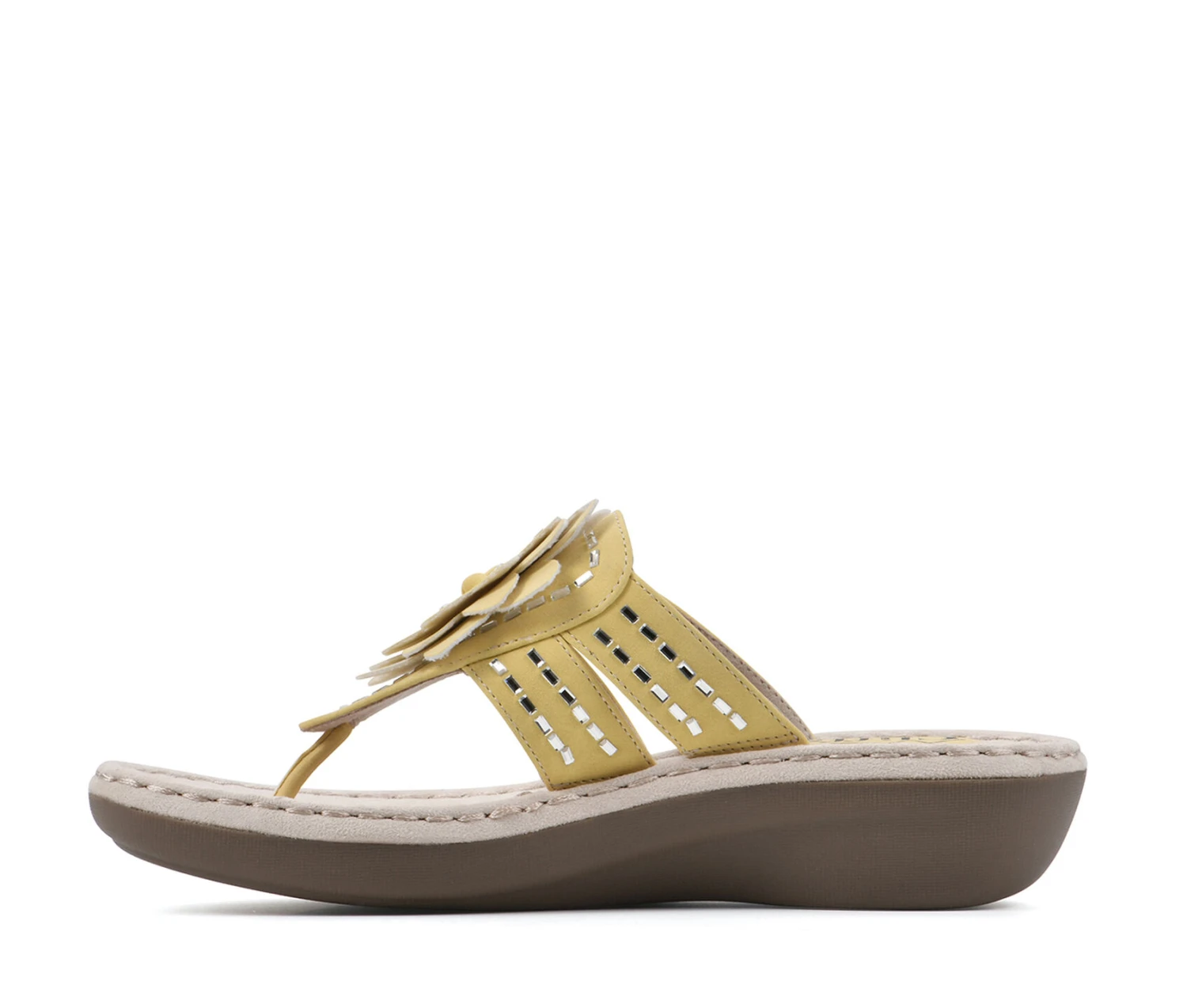 - These comfort thong sandals feature a wedge and an ornamental flower. Soft toe post. Contrast stitching.