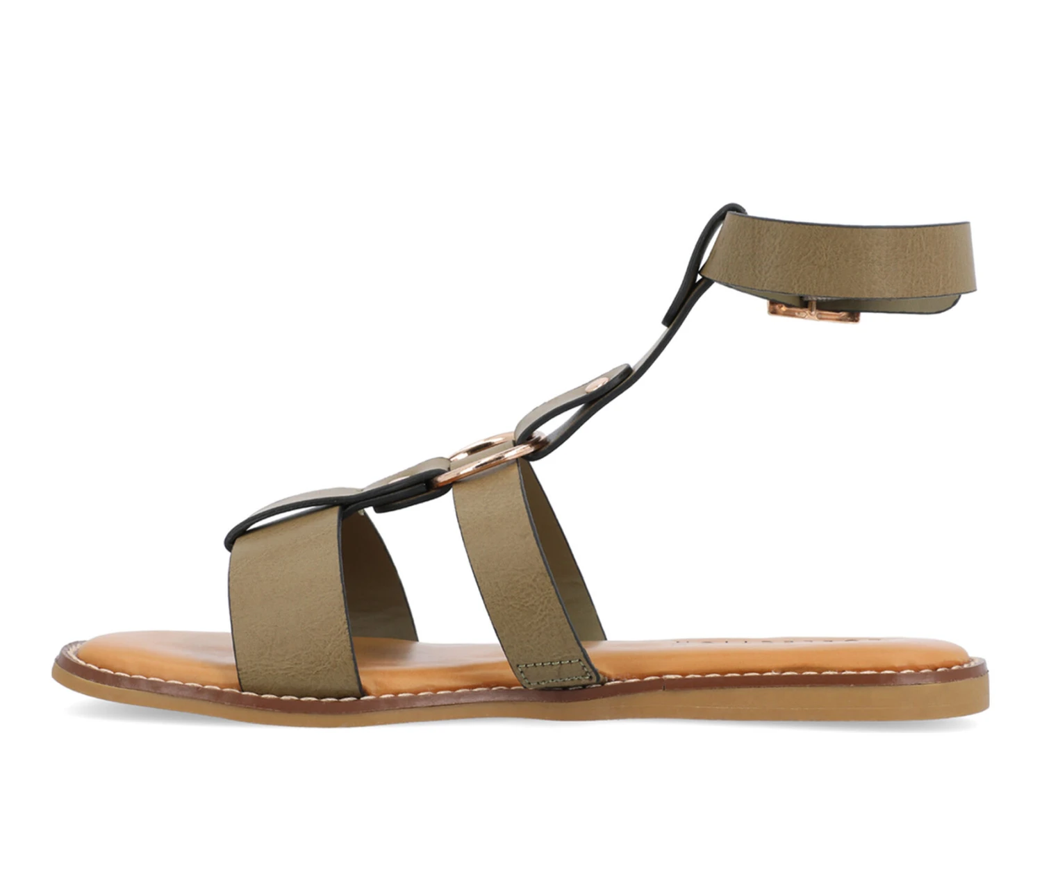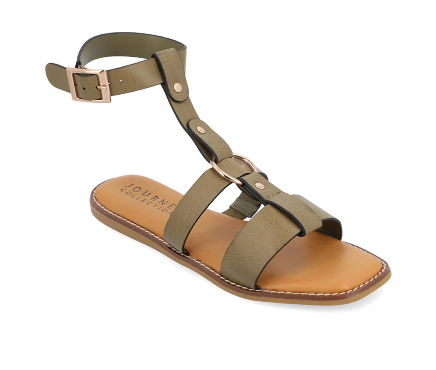 - The Eleanora sandal from Journee Collection will be the perfect take on a new look that will boost your confidence like no other. Their luxe vegan leather, T-strap design, buckle ankle strap, and open square-toe will let you go anywhere in all the style you want. As a bonus, their 4 mm Tru Comfort Foamâ„¢ insole and buckle closure will leave your feet comfortable for your daily errands.
