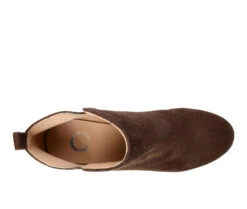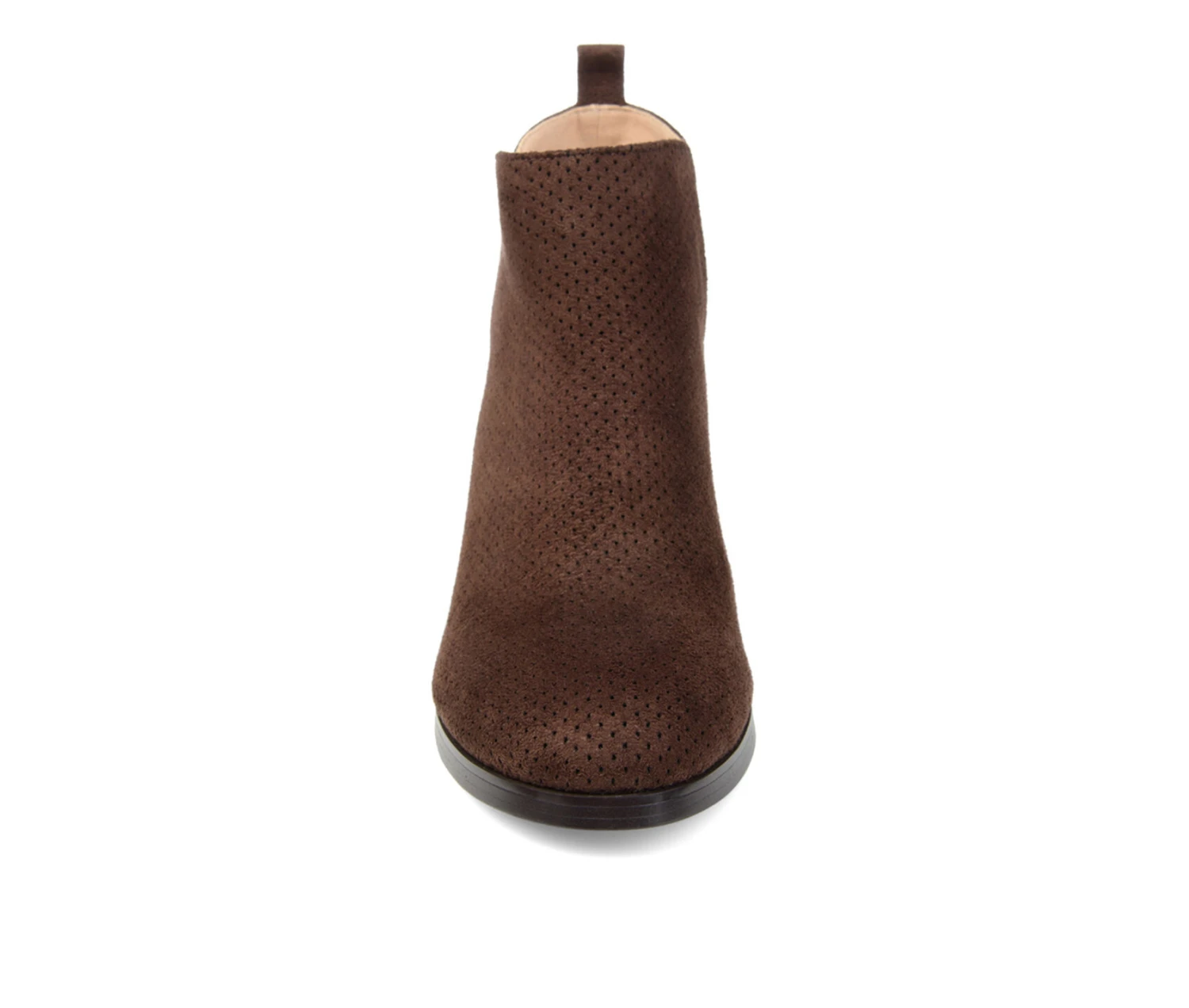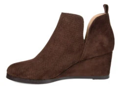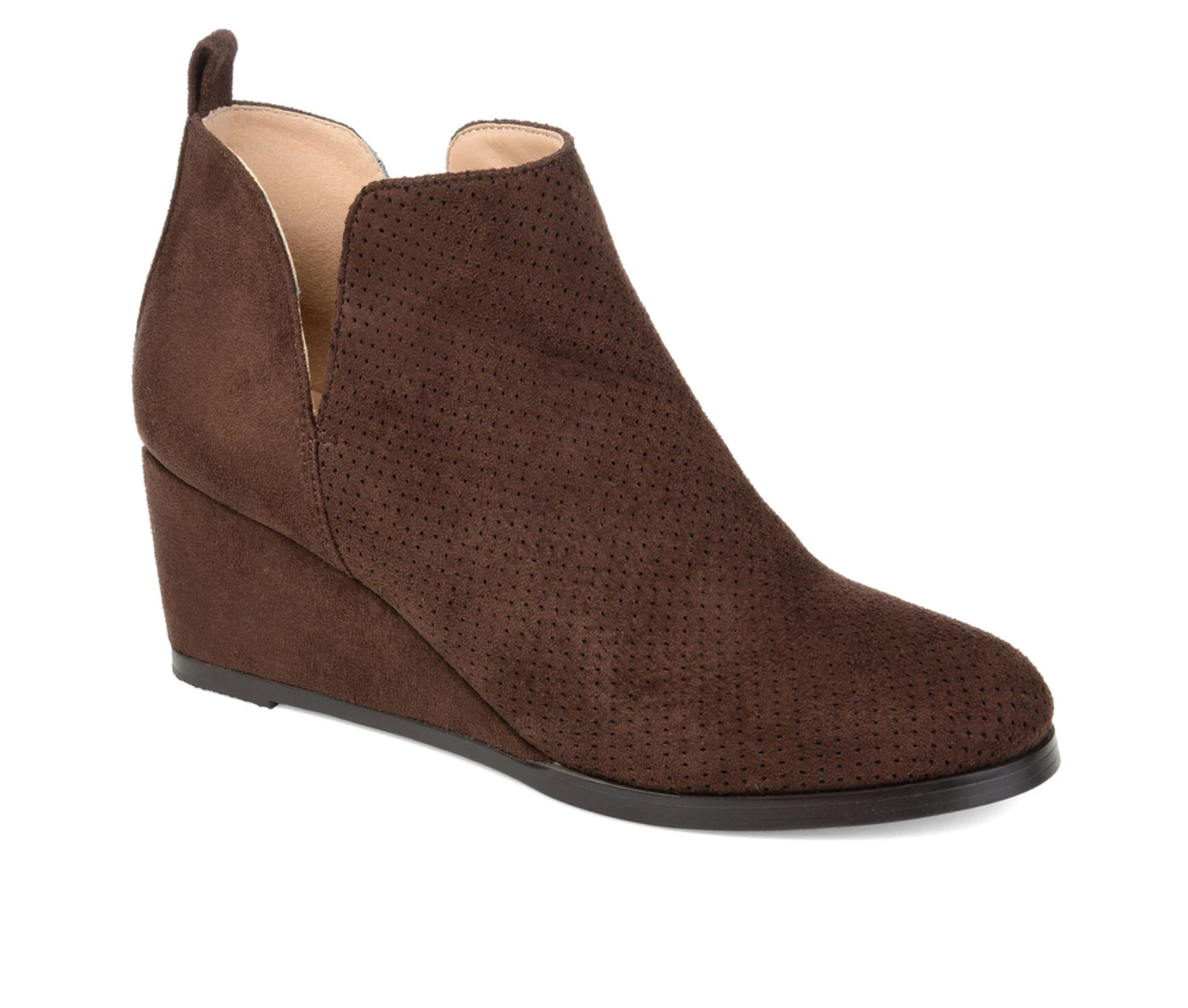 - Trendy and Chic are the Mylee bootie by Journee Collection. This stylish bootie features a soft faux suede material with a perforated detail on the top. The deep V cut-outs make for easy pull-on entry while the slight wedge adds attractive height.