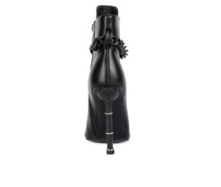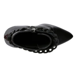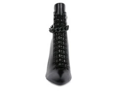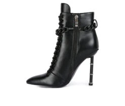 - The stiletto heeled boots are gorgeous with the lace up details and added gold chain that makes a distinctive statement. The high pointed heels are ringed. Laceup detail supportend by metallic eyelets look beautiful. These have side zipper details which make it easy to wear.