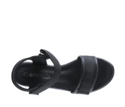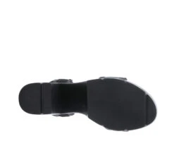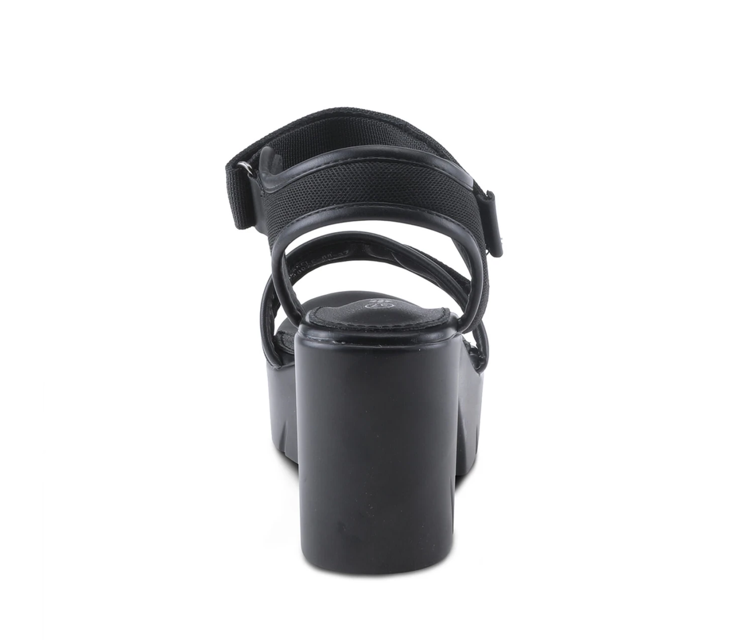 - A contemporary platform quarter strap sandal featuring a mesh upper with a tonal faux leather trim and a hook and loop ankle strap closure for adjustability on a light weight, chunky unit bottom with arrowhead indentations.