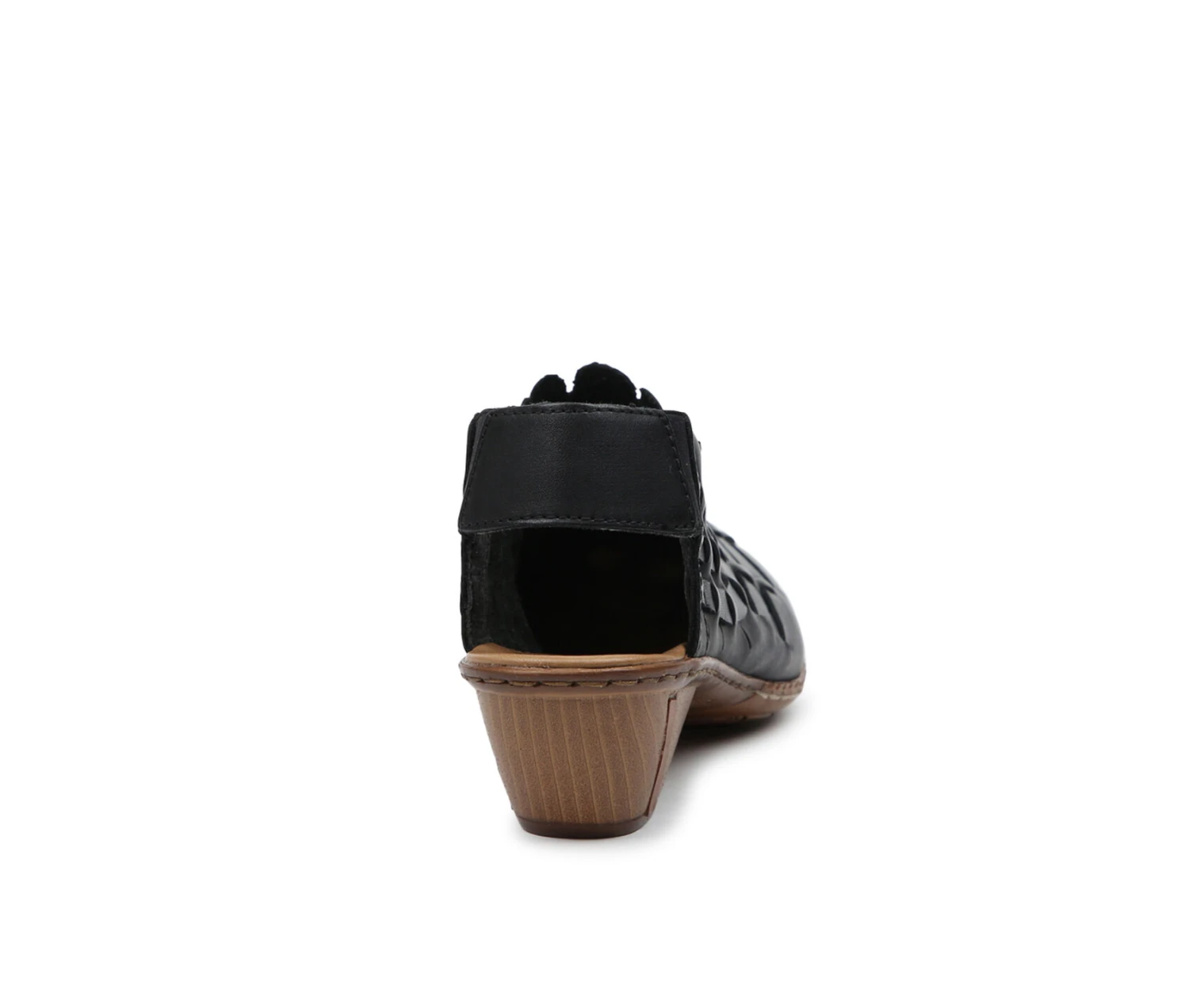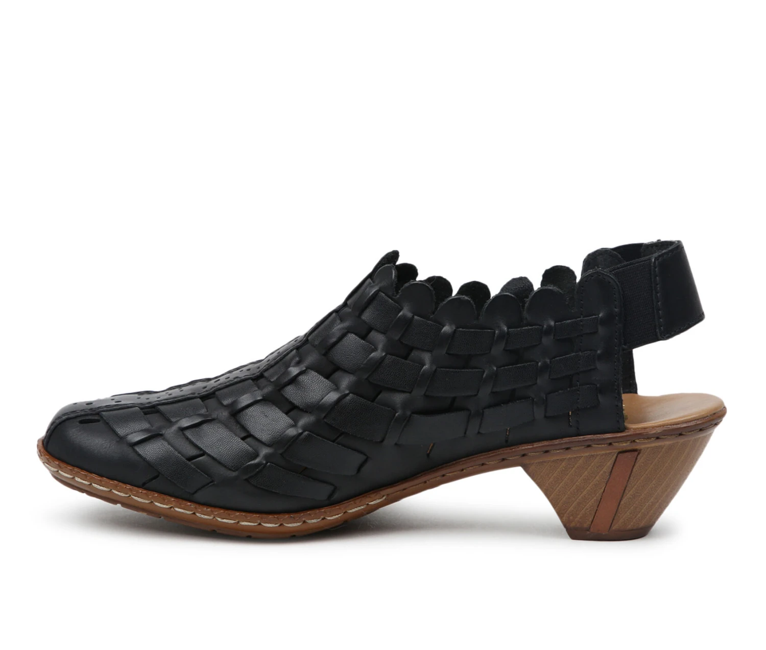 - The fashionable style features a scalloped topline and woven leather upper. The elasticized back strap provides a secure and flexible fit for an easy on and off wear.